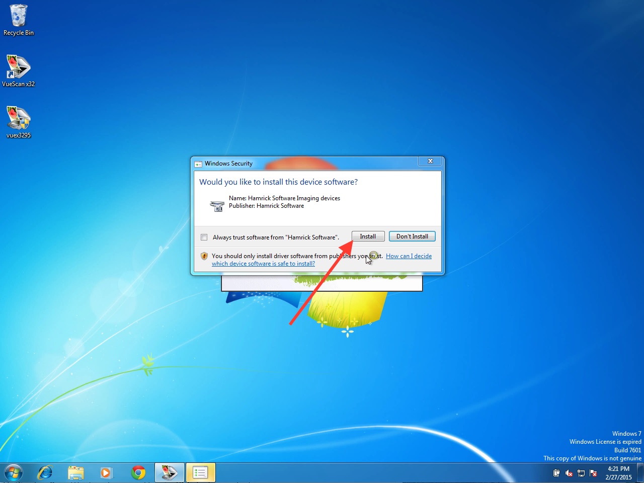Windows may then ask you if you would like to install a device driver. This will allow you to scan from other applications. This won't conflict with any drivers you already have, includings ones from your scanner's manufactuer. Press Install to install the device driver and continue the installtion process.