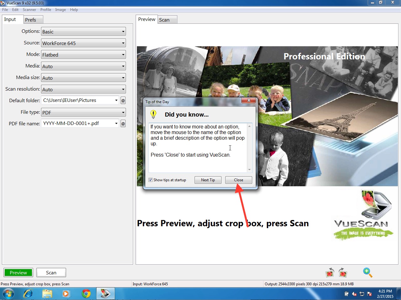 When you first open VueScan it will show a tip of the day. Press 'Close' to close the tip of the day and start VueScan