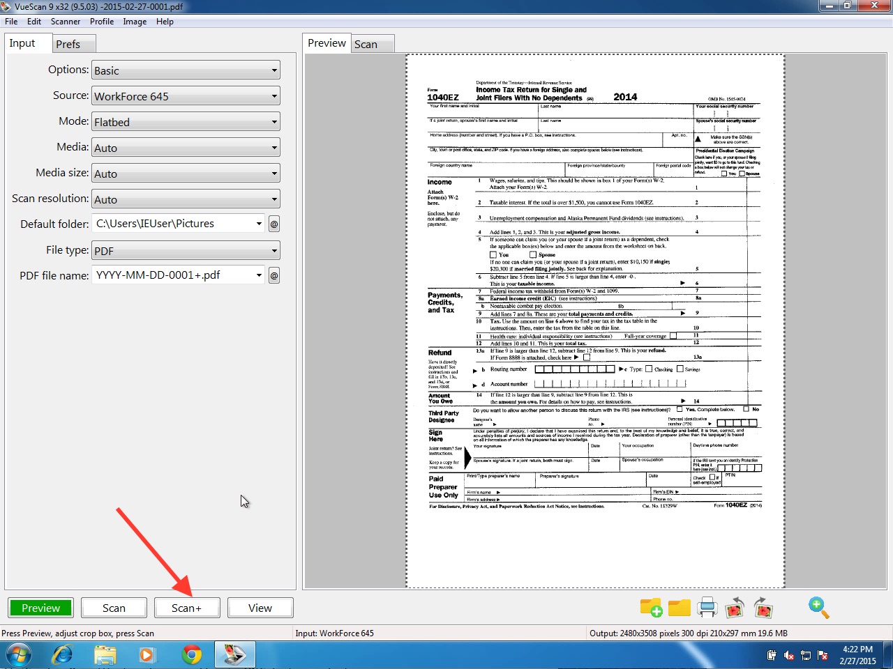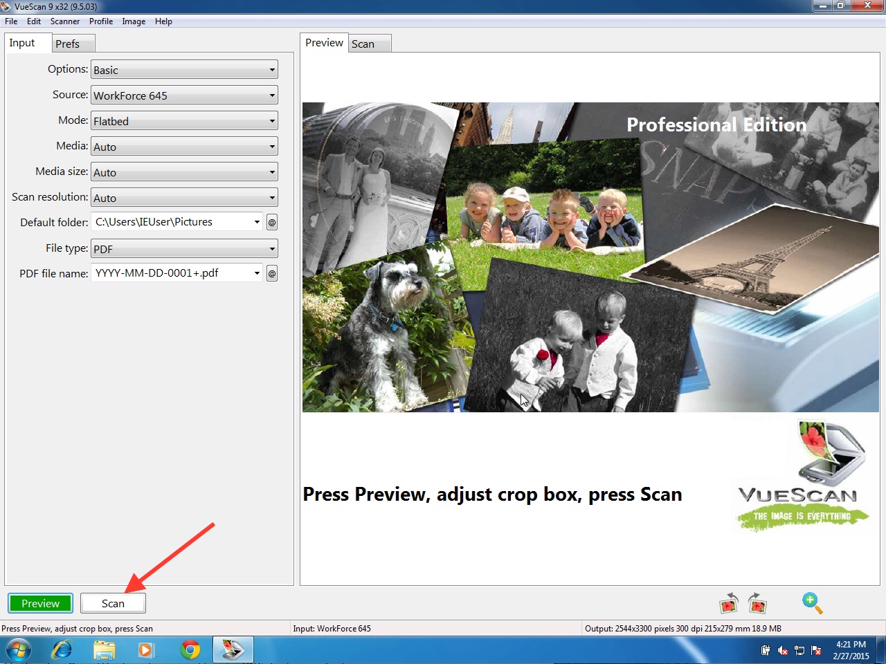 Put a document on to the flatbed of the scanner. Then press the 'Scan' button in VueScan. It will then take a few seconds to scan your document.