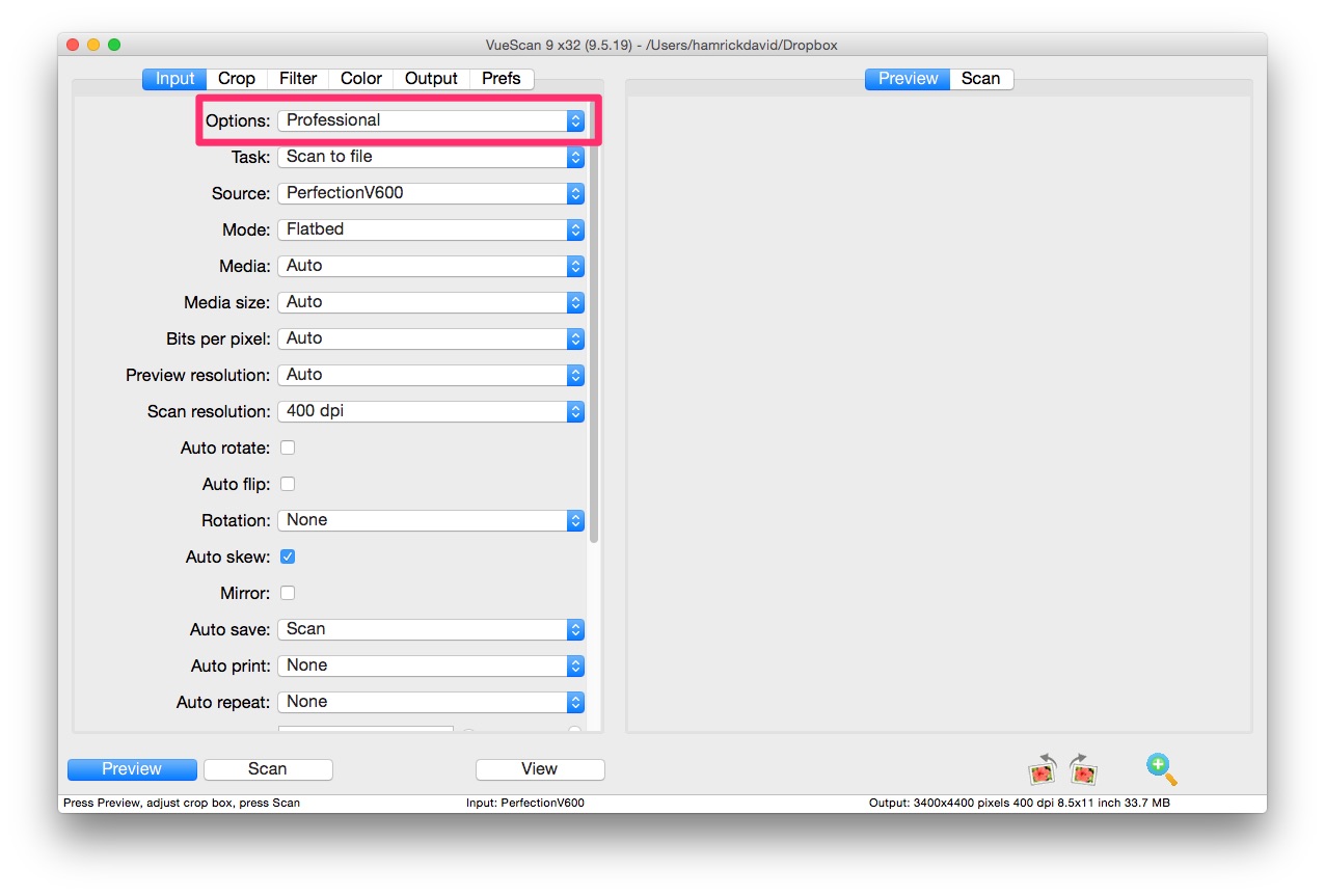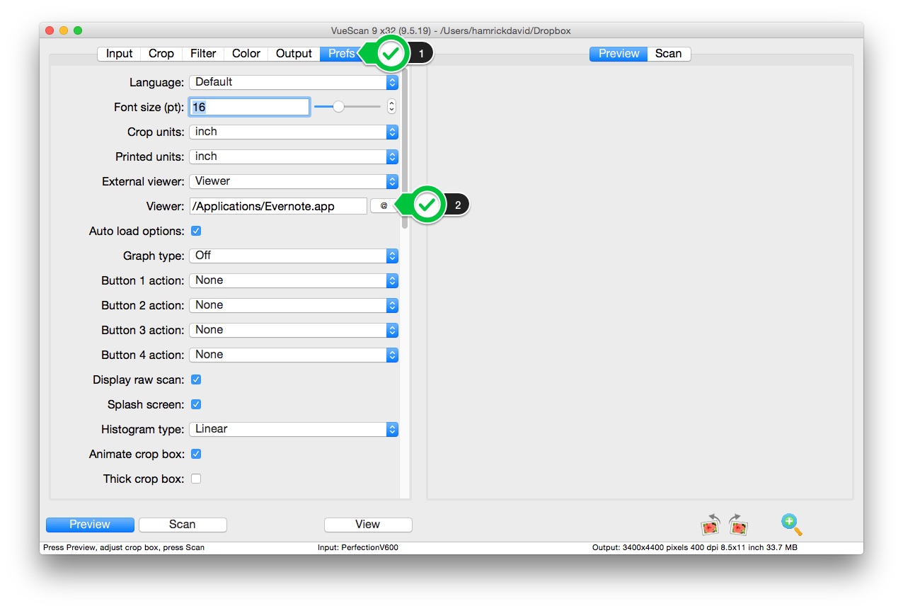 After you’ve scanned a document, you might want to save it in another application like Evernote. This is really easy to do in VueScan. Just set the external viewer to your application of choice, like in this example.